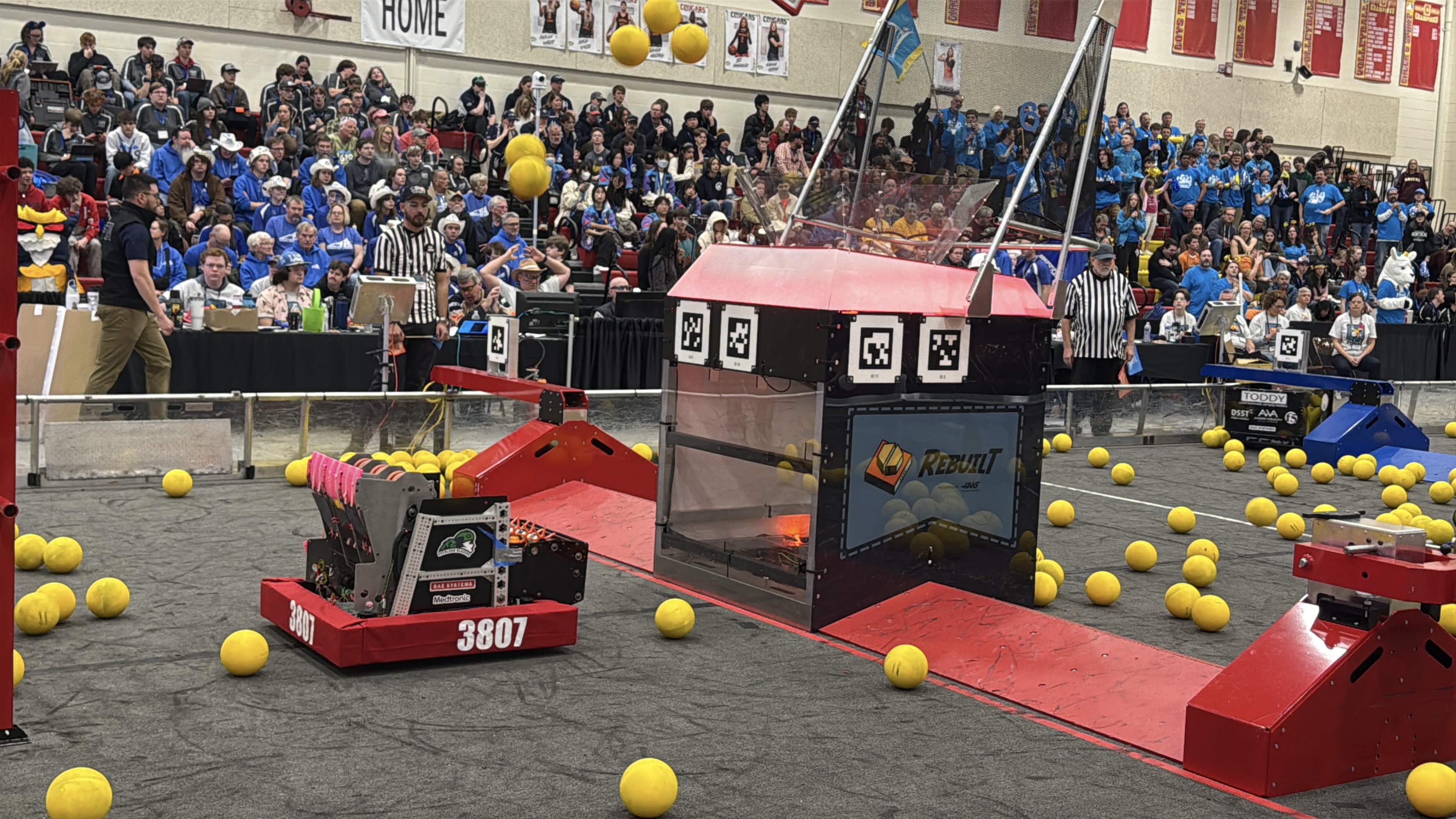 For the first time in team history, the BlazerBots will compete at two regional events: the Pikes Peak Regional in Colorado Springs and the Denver Regional in ... Denver! To compete at these events, the team designed and built "Aspiring Dumper". The team originally designed the robot to focus on scoring fuel via triple-fixed angle shooters and finished 25th out of 33 teams at Pikes Peak. Through a unique series of events, 3807 was called in as a backup robot for the 2nd seeded alliance and played one match in the playoffs and were named event finalists alongside teams 9068, 4499, and 8334. Going into the Denver Regional, the team redesigned their robot to fill the role of a defensive fuel-herding robot. We'll see you at DU!